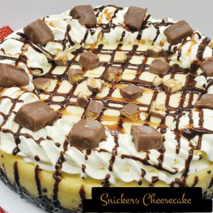 Sweet creamy cheesecake topped with melted Snickers candy an Snickers pieces.